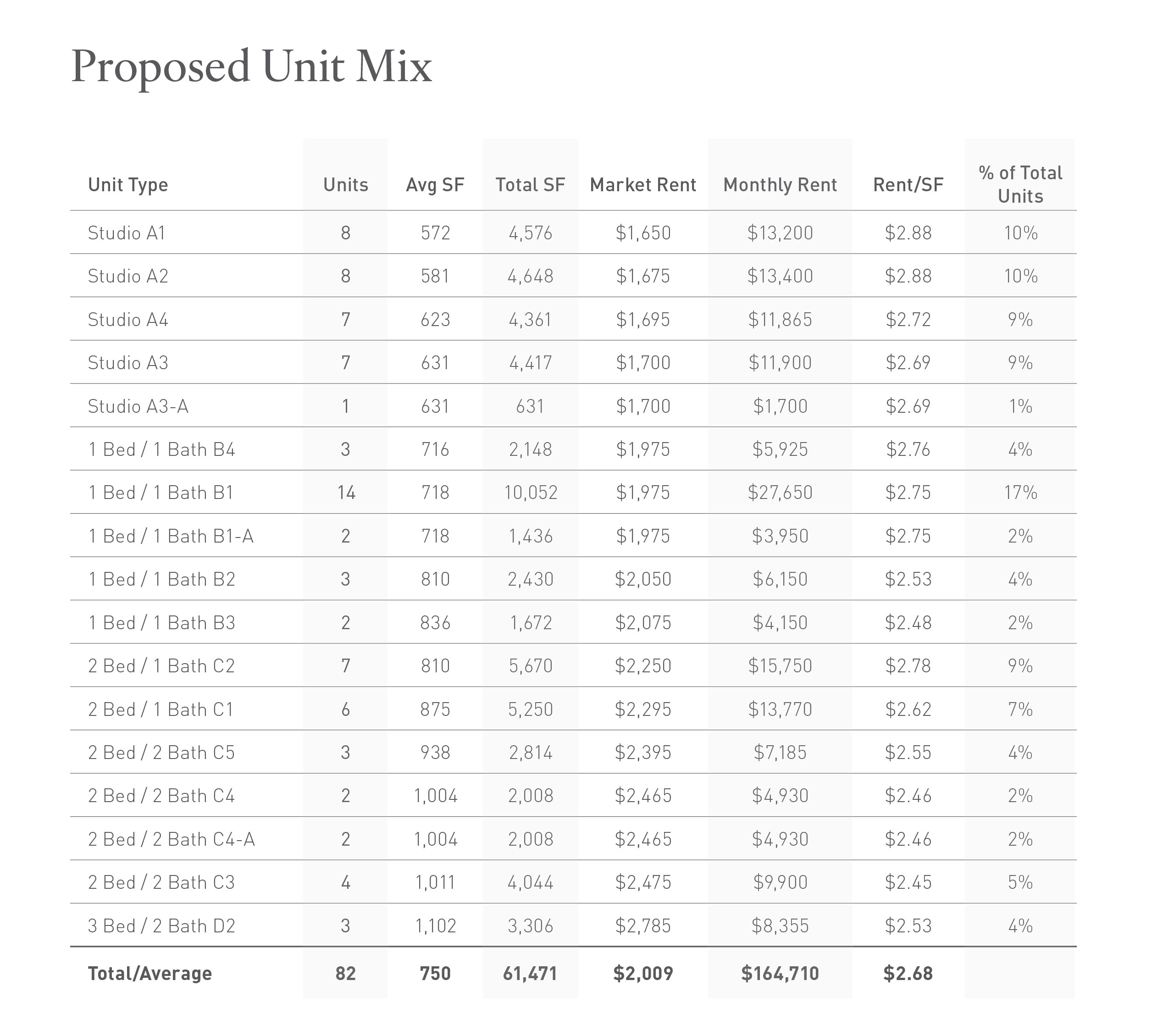 Diverse Unit Mix: Plans include an optimal mix of studios, one-, two-, and three-bedroom units averaging 750 square feet, appealing to a broad renter demographic.