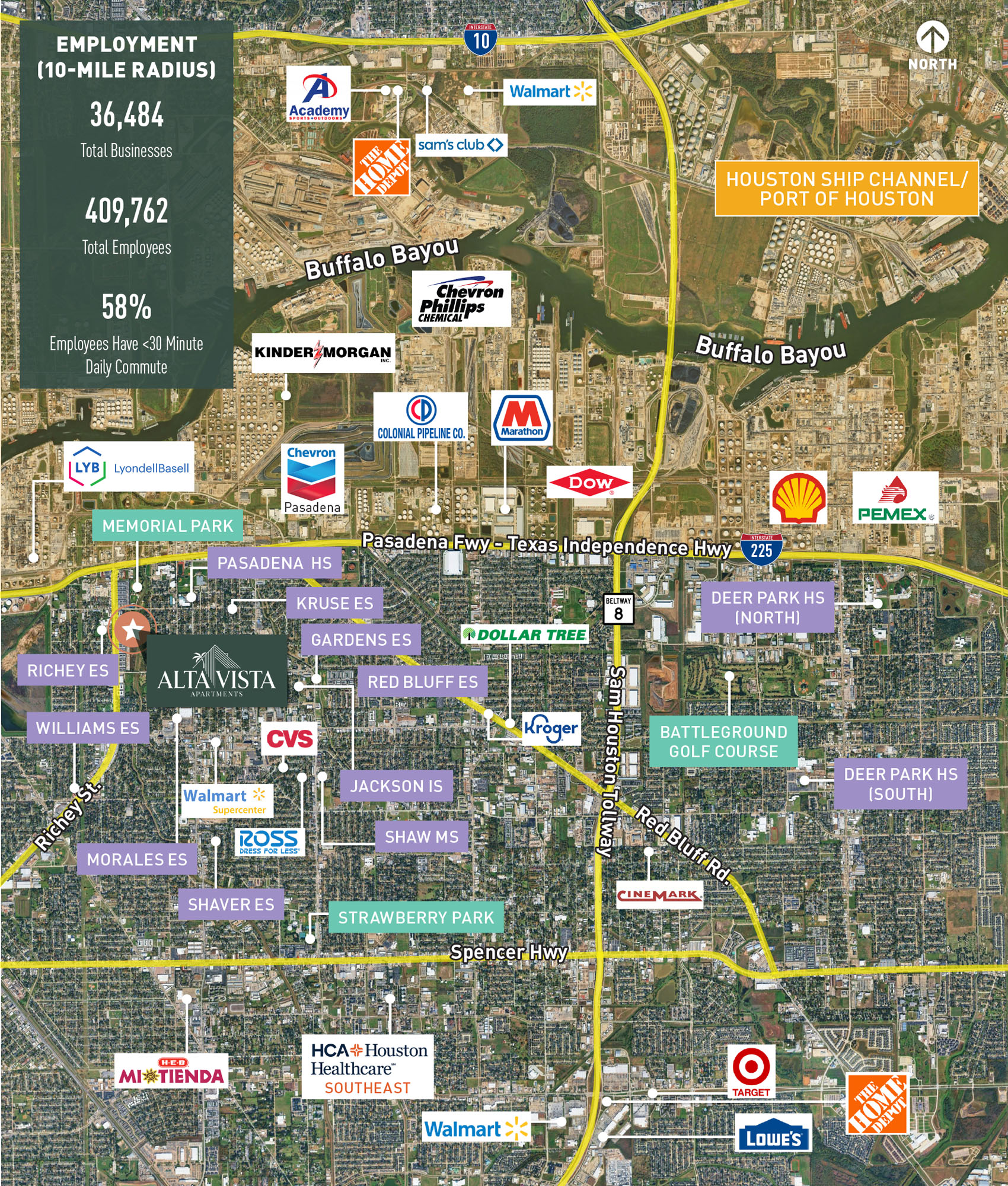 - 92K jobs within five miles and 410K jobs within ten miles, including the Port of Houston and major local employers, HCA Houston Healthcare Southeast and San Jacinto Community College