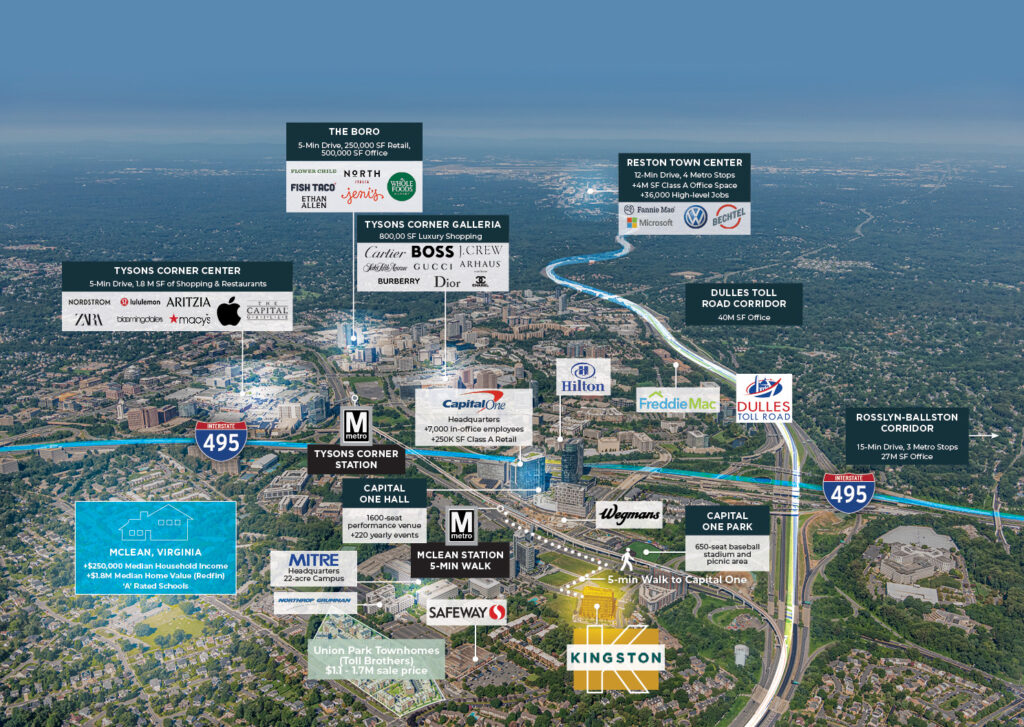 Located less than 0.5 miles from Capital One’s 7,000-employee global HQ, Kingston sits in the heart of Tysons’ top 10 office market nationally. MITRE, Freddie Mac, and Northrop Grumman provide additional walkable demand drivers.