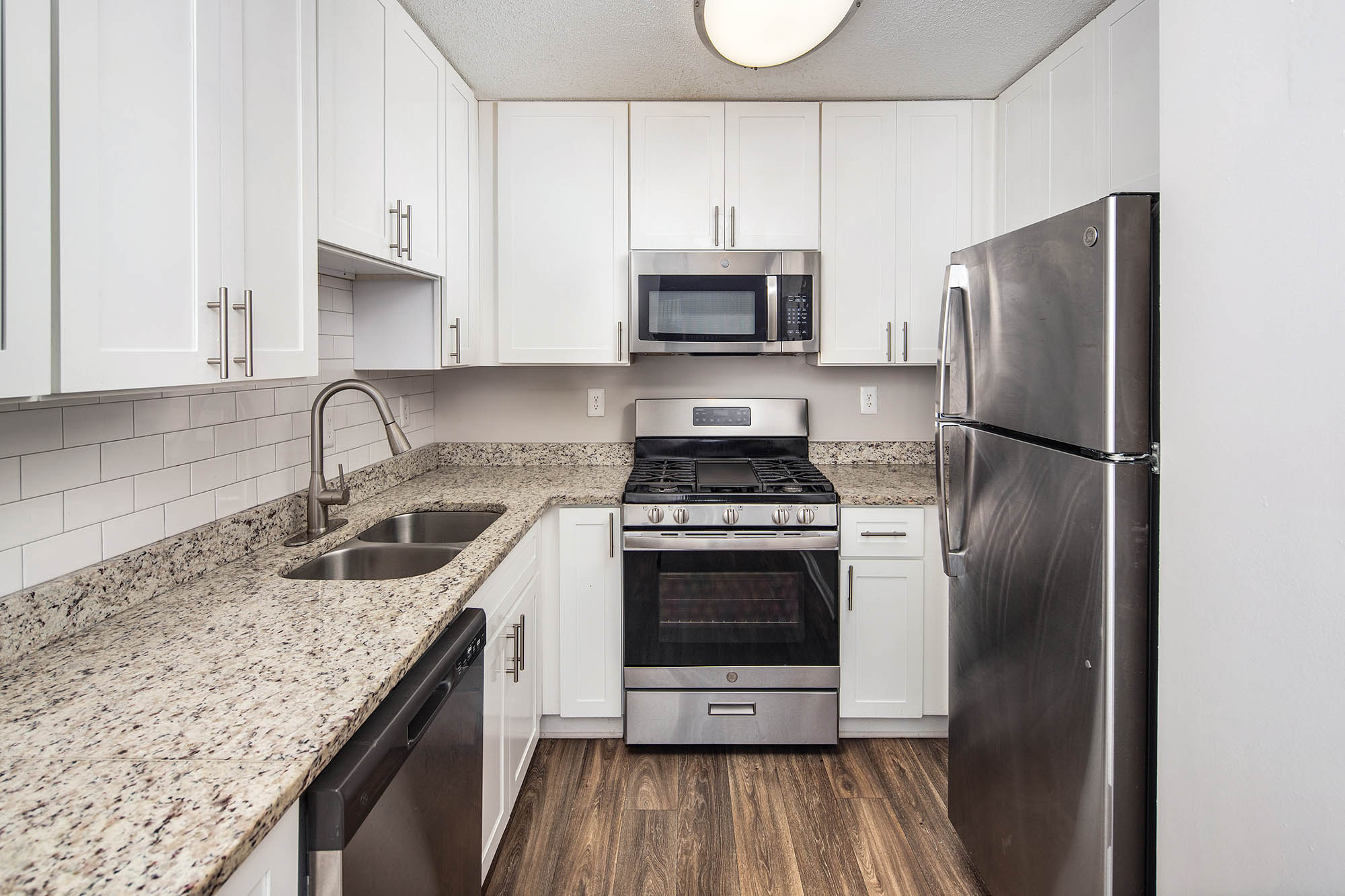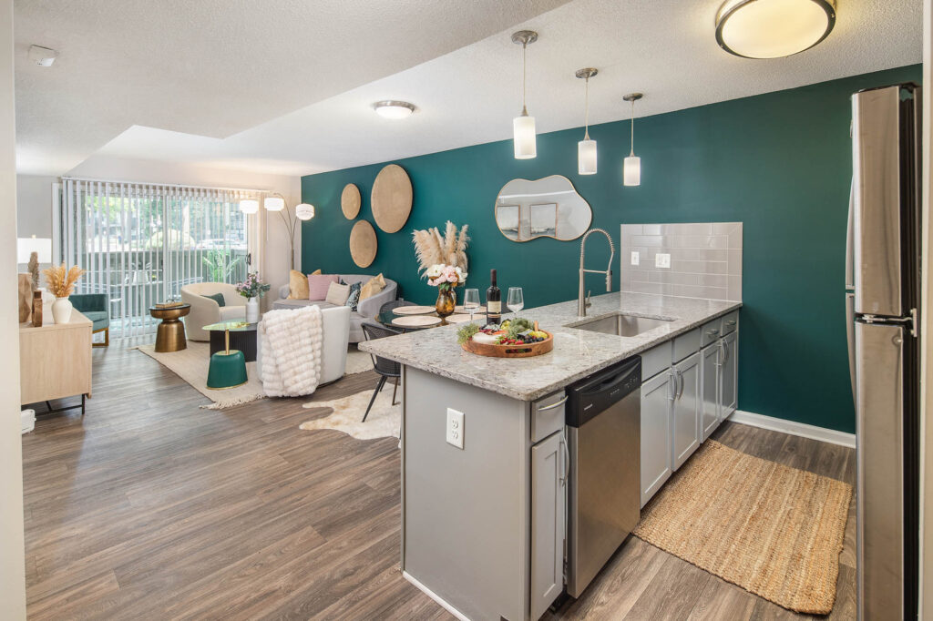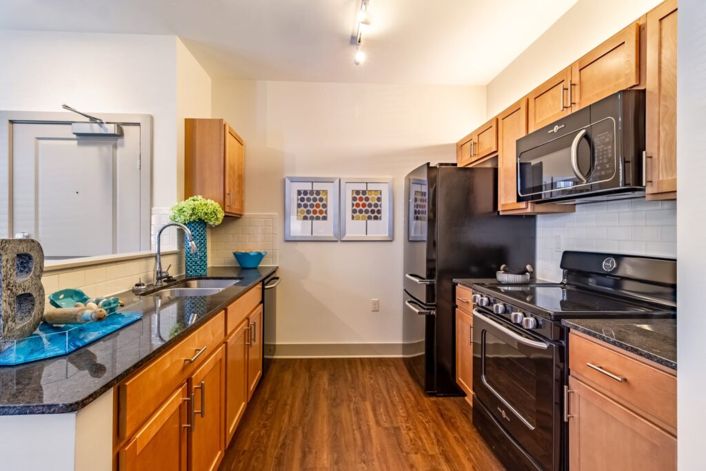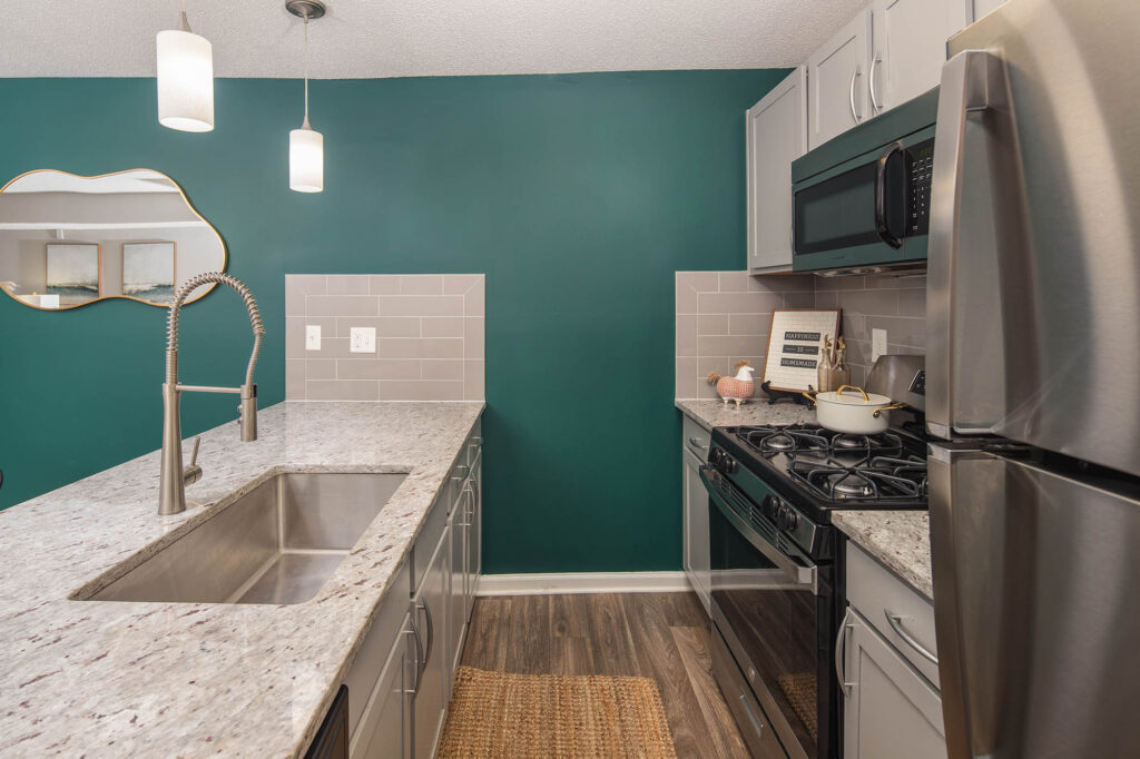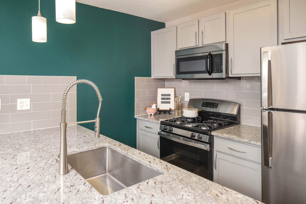 - Spacious and beautifully appointed apartment interiors with stainless steel appliances, granite countertops, subway tile backsplash, etc…
