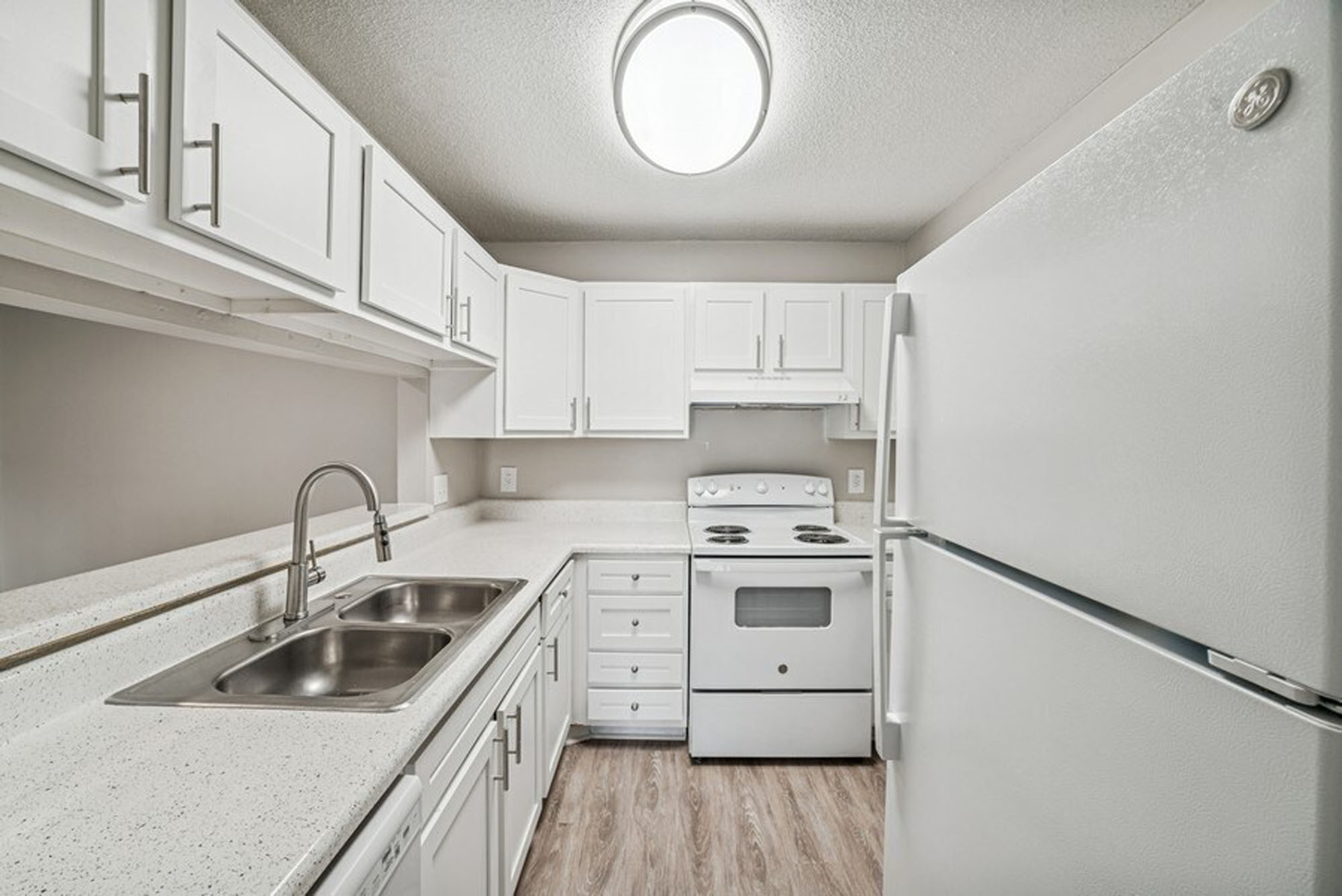 • Kitchen appliances include a refrigerator with ice maker, oven/range, microwave, dishwasher, and garbage disposal