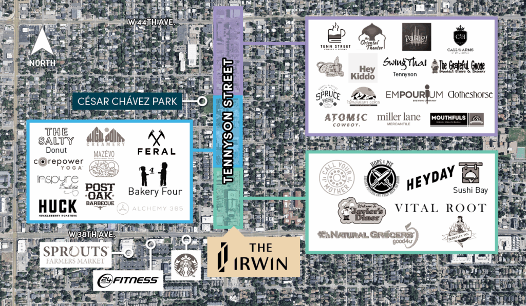 Situated at the intersection of Tennyson Street and 38th Avenue, The Irwin offers easy access to local attractions such as Tennyson Street, 32nd Ave retail, Edgewater Public Market, and Sloan’s Lake Park.